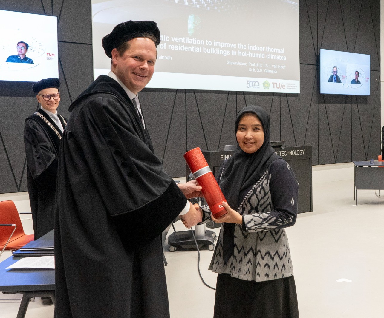 Dosen Program Studi Arsitektur tersebut dinyatakan lulus setelah mempertahankan disertasinya dalam ujian terbuka promosi doktor (PhD Defense) yang dipimpin Prof. dr. ir. M.C.J. Hornikx. Sidang doktor ini melibatkan tim penguji internasional dari berbagai negara, di antaranya Prof. dr. ir. P.J.V. van Wesemael dan Prof. dr. ir. J.L.M. Hensen dari TU/e Belanda, Prof. dr. W. Liu dari Tianjin University, China, serta Prof. dr. ir. L. Georges dari Norwegian University of Science and Technology, Norwegia. Penelitian ini dibimbing oleh Prof. dr. ir. Twan van Hooff sebagai promotor dengan Dr. ir. Stefanie Gillmeier sebagai ko-promotor.